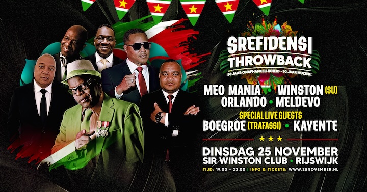 Dinsdag 25 november: 50 jaar onafhankelijkheid – 50 jaar muziek! Srefidensi THROWBACK in de Sir Winston Club Rijswijk – de lekkerste hits van de afgelopen 50 jaar! Met DJ’s MEO MANIA, ORLANDO, MELDEVO en WINSTON uit Su! Special guests: BOEGROE (van Trafassi) en KAYENTE (van La Rouge). Dinsdag 25 november van 19.00u – 23.00u. Info & tickets vind je hier.