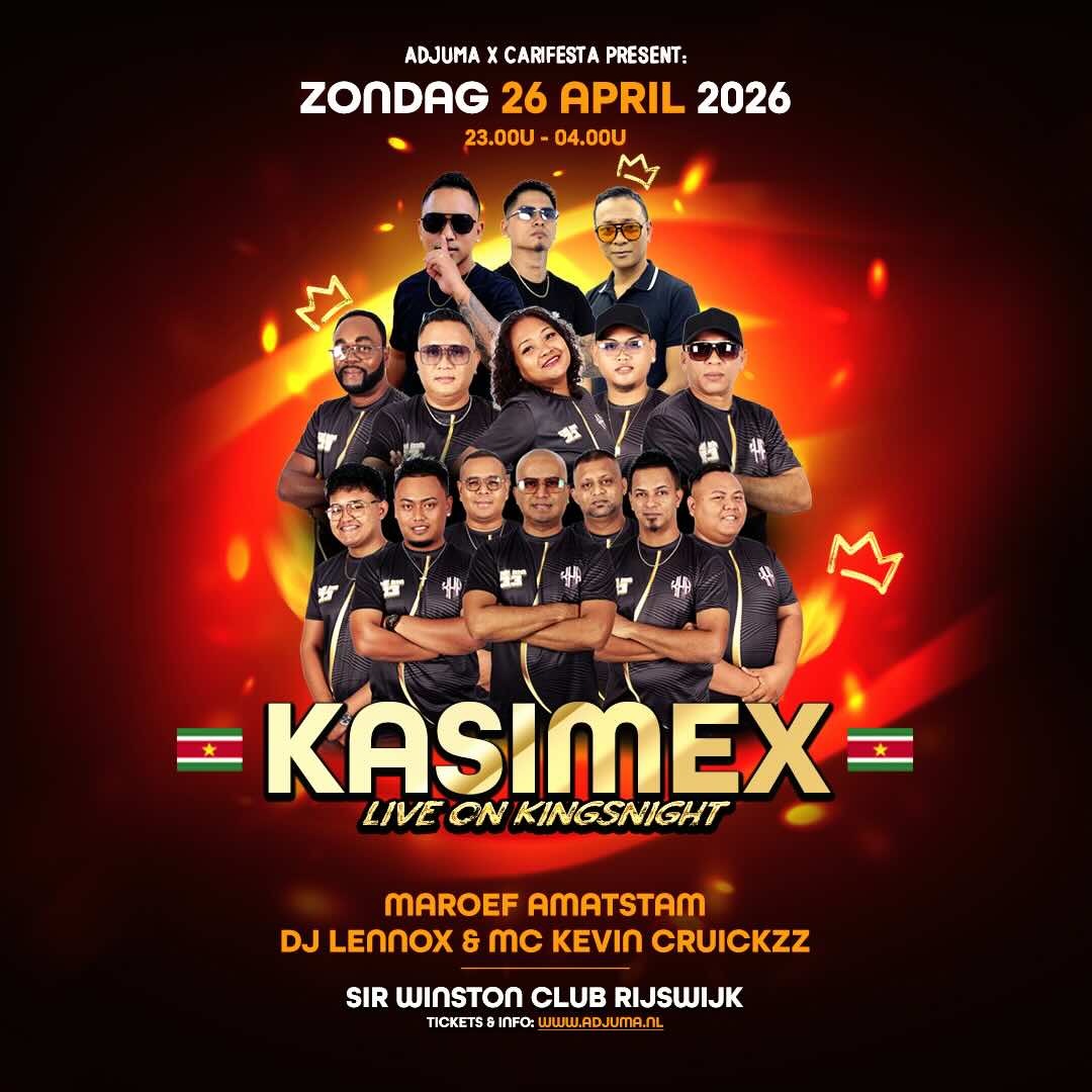 De KASIMEX House Band uit Suriname komt weer naar Nederland en staat op Koningsnacht (ZONDAG 26 april 2026) live in de Sir Winston Club Rijswijk (Zuid-Holland). Het wordt een gezellige avond powered by ADJUMA x CARIFESTA! Op deze editie zijn ook Maroef Amatstam, DJ Lennox en MC Kevin Cruickzz uit Suriname van de partij.