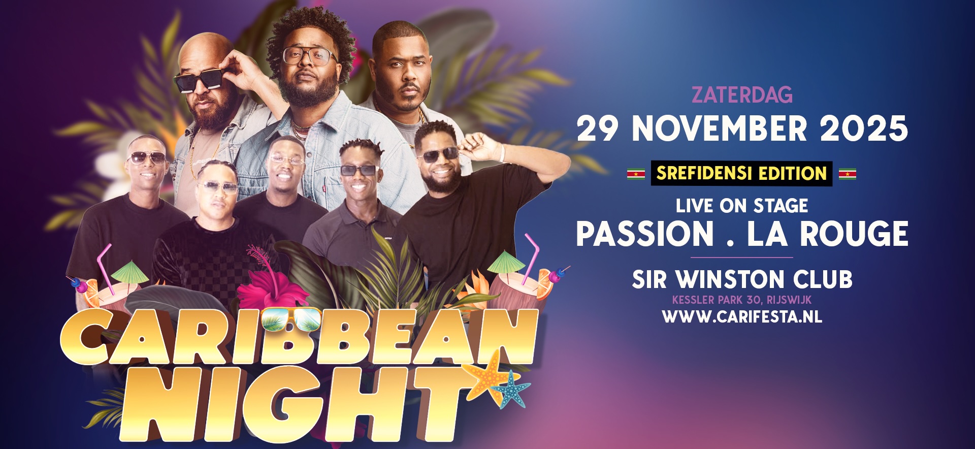 Op zaterdag 29 november 2025 is Carifesta weer terug in de Sir Winston Club Rijswijk met een hele speciale editie van onze altijd gezellig Caribbean Night! Speciaal omdat we in verband met Srefidensi weer twee topbands mogen ontvangen namelijk PASSION en LA ROUGE! Deze combinatie maak je niet vaak mee in de Sir Winston Club, deze regel je kaarten op tijd! Er zijn speciale EARLY BIRD duo en groeptickets maar de voorraad is beperkt. Dus wacht niet en haal je kaarten meteen hier.