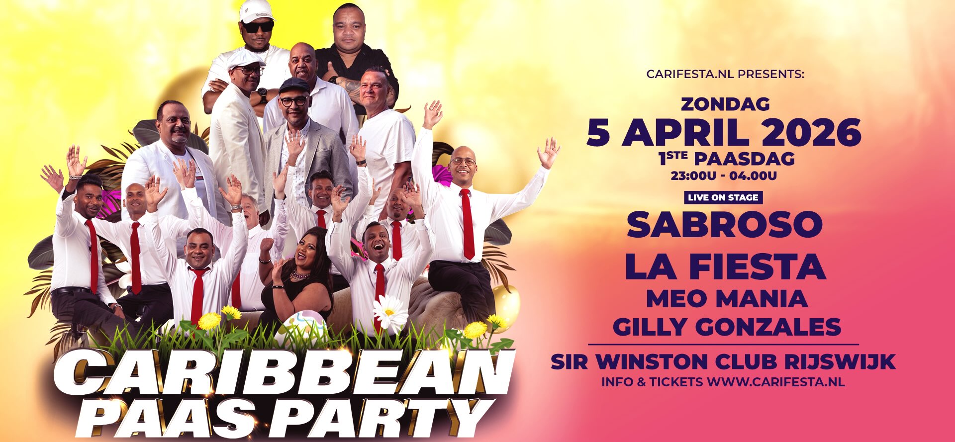 In het Paasweekend is de altijd gezellige Caribbean Party terug in de Sir Winston Club te Rijswijk. Op zondag 5 april 2026 (1ste Paasdag) gaan we dansen met twee topbands: SABROSO & LA FIESTA! Tussendoor zorgen DJ’s GILLY GONZALES en MEO MANIA voor de lekkerste hits.