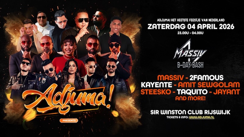 De band MASSIV’ is jarig en dat vieren we komend weekend – op zaterdag 4 april 2026 – in de Sir Winston Club te Rijswijk. Naast MASSIV’ zijn ook 2FAMOUS, KAYENTE, AMIT SEWGOLAM, STEESKO, TAQUITO, JAYANT en vele anderen van de partij. Haal je voordelige kaarten voor deze B-DAY BASH nu online via adjuma.nl